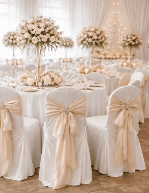 La venta al mayoreo de cubre sillas puede complementarse con caminos de mesa, mantelería, fundas para mesas, moños decorativos y flores artificiales. Tener todo esto en tu inventario te permite ofrecer soluciones completas a organizadores de eventos, hoteles y salones de fiestas.